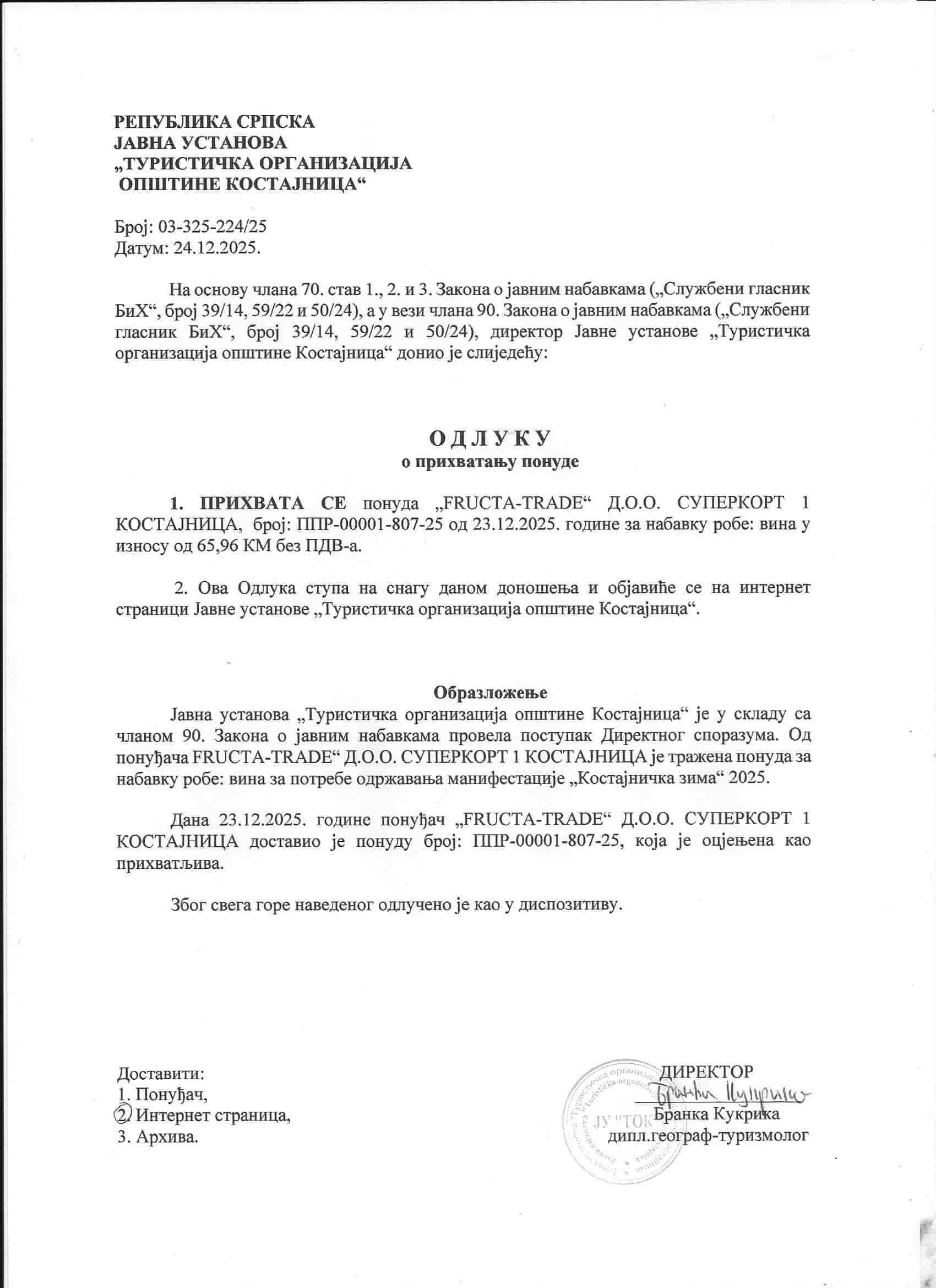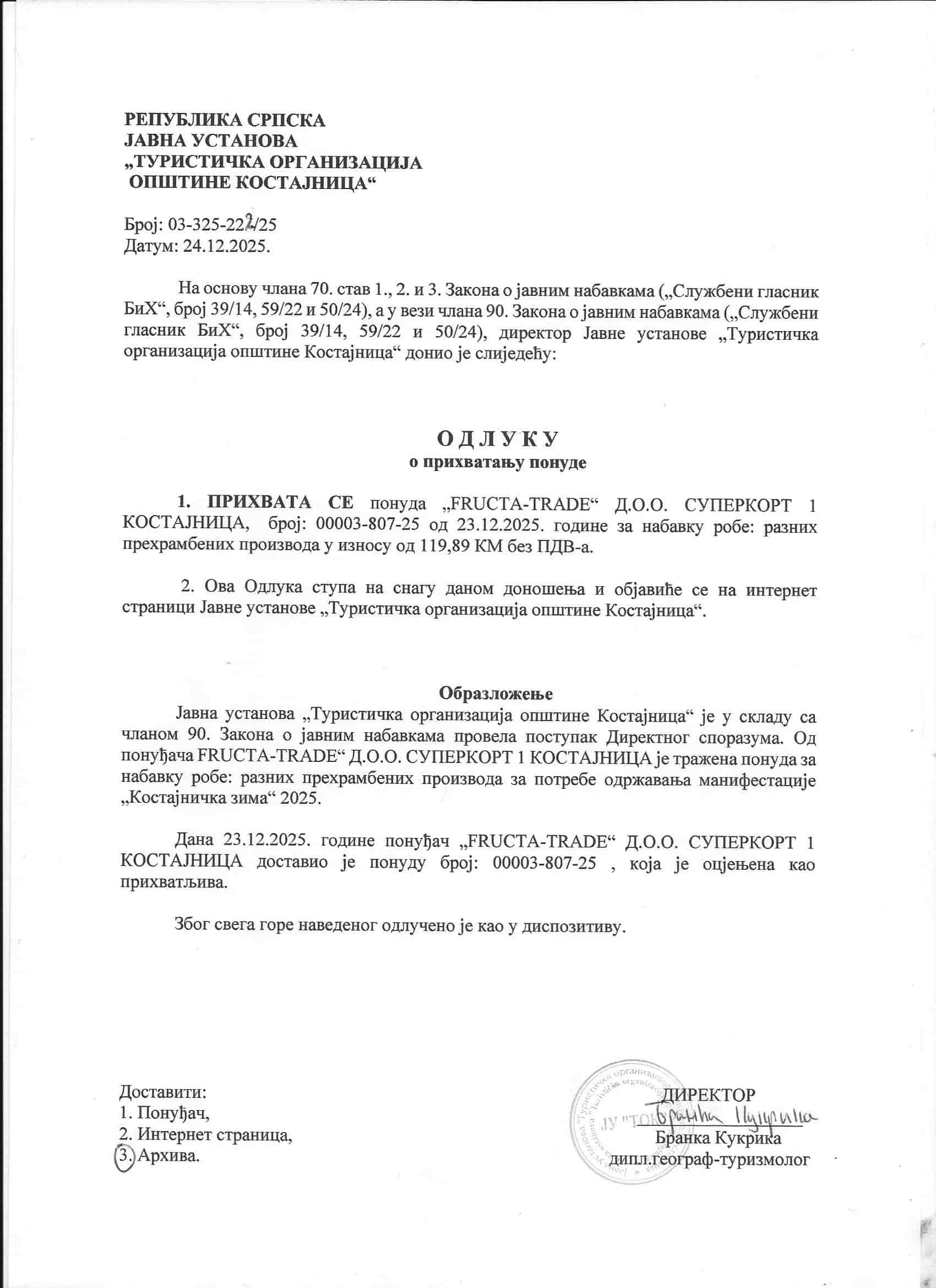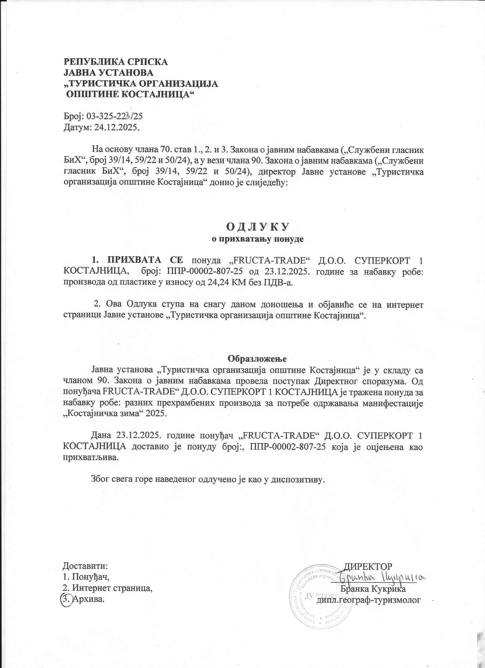 Одлука о прихватању понуде – ФРУКТА ТРЕЈД